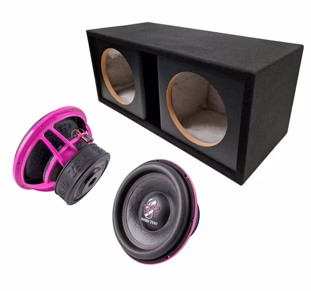 BASSKIT Ground Zero Radioactive PINK inkluderar 2 st GZRW 300SPL PINK subwoofers och en robust 4-AI212SLOT-låda.