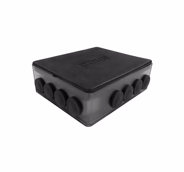 Säkringsdosan har ett öppningsbart lock av flexibelt gummi, vilket gör säkringsbyten enkelt och snabbt. Ramen är tillverkad av väderbeständig plast och du kan fästa den genom att skruva fast den med hjälp av hålen i basen.