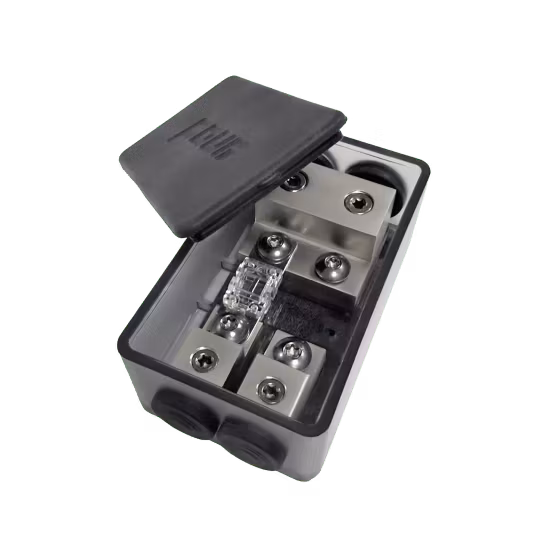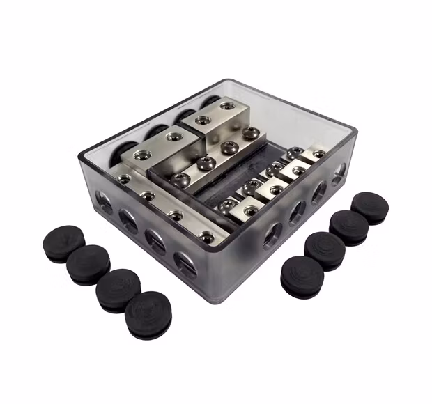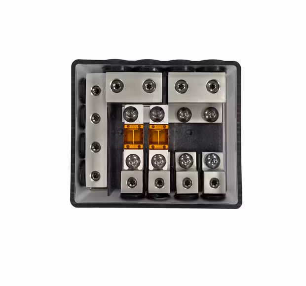 Högkvalitativ stänkskyddad mini-ANL-säkringshållare. Inuti finns fyra platser för mini-ANL-säkringar. Denna produkt kombinerar både ett kraftfördelningsblock och ett jordfördelningsblock i ett.